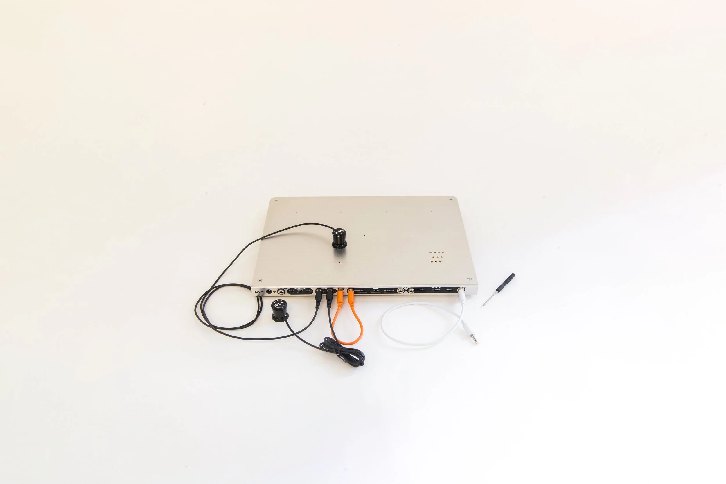 The Chromaplane has three inputs and three outputs. For patching only on the instrument itself, two patch cables (15 cm and 30 cm) are sufficient for internally routing both feedback and the envelope. Three to six longer cables for interfacing with other gear is also recommended.